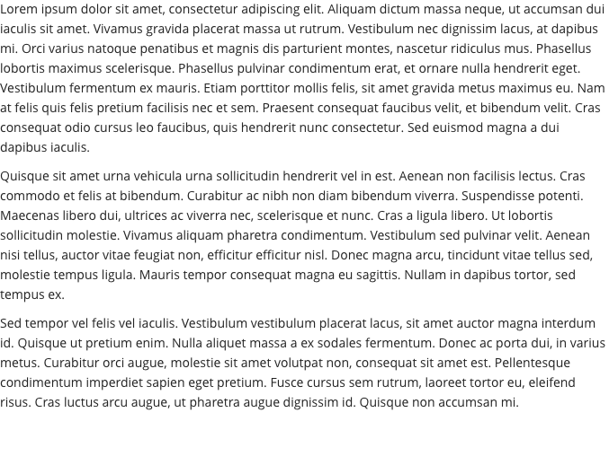 Lorem ipsum dolor sit amet, consectetur adipiscing elit. Aliquam dictum massa neque, ut accumsan dui iaculis sit amet. Vivamus gravida placerat massa ut rutrum. Vestibulum nec dignissim lacus, at dapibus mi. Orci varius natoque penatibus et magnis dis parturient montes, nascetur ridiculus mus. Phasellus lobortis maximus scelerisque. Phasellus pulvinar condimentum erat, et ornare nulla hendrerit eget. Vestibulum fermentum ex mauris. Etiam porttitor mollis felis, sit amet gravida metus maximus eu. Nam at felis quis felis pretium facilisis nec et sem. Praesent consequat faucibus velit, et bibendum velit. Cras consequat odio cursus leo faucibus, quis hendrerit nunc consectetur. Sed euismod magna a dui dapibus iaculis.