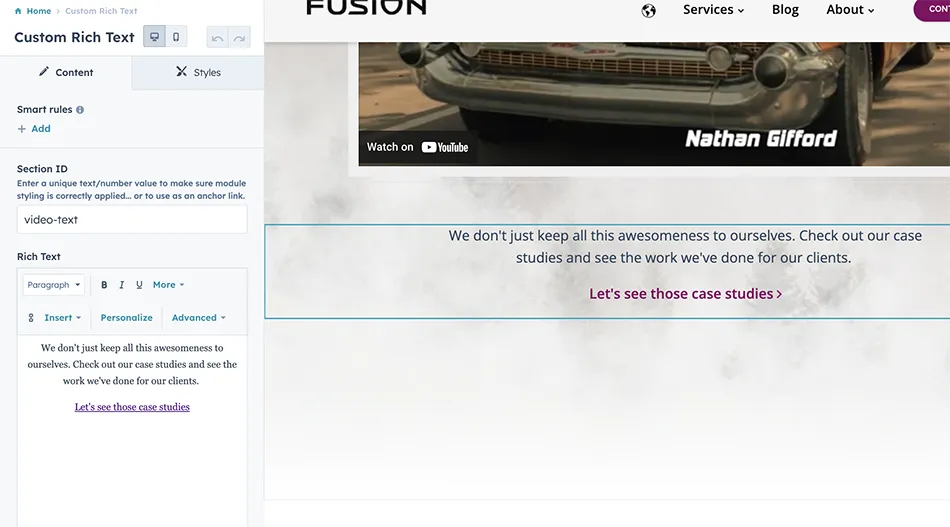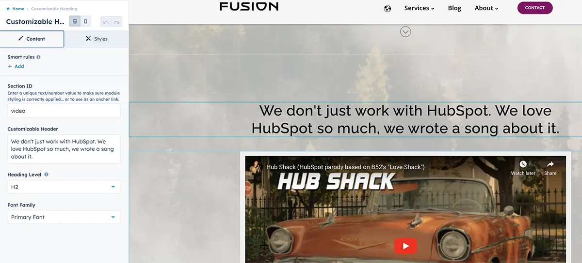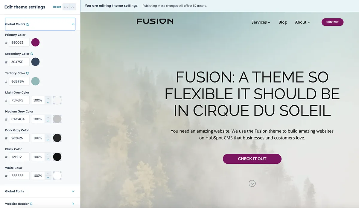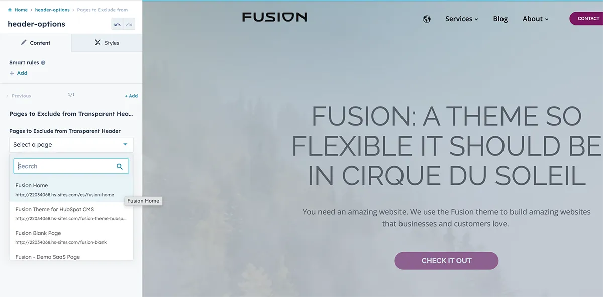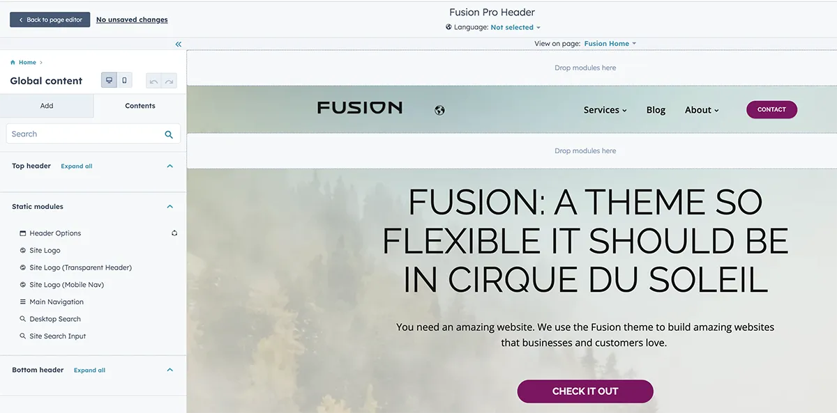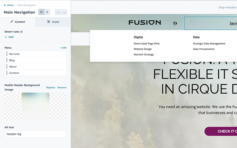 One of the great features of the Fusion theme is the Megamenu module! It allows you to create a menu that goes well beyond the normal dropdown menus, although you can still do that if that's what you want. You can see the mega menu in action on our demo site, but let's walk through how to set it up: Now, this module is only accessible via the global header, so it doesn't show up in the list of modules that you can drop on any page. So, click on the header from any page editing screen and open the global header edit view. You will be prompted that it is a global element. Confirm and proceed. Module Fields Once it opens, click the "Content" tab on the left side panel. This will show all of the elements included in the header. Click on "Main Navigation" to open the Megamenu module with these options: Menu. This is the top level of your menu... the items you see across the top within your header. This is a repeater so you can add, edit, delete and re-order these items. Within each one, you will find many other settings, but this is the starting point. Mobile Header Background Image. When the mobile menu opens, the logo shows at the top and there is a background image behind it. Here you can replace (or remove) that background image. Configuring the Parent Level Menu Items When creating or editing a parent level menu item as seen above, you will configure the following items: Menu Item Text. This is the text label for the actual menu item. Menu Type. This is an important selection as it directs the rest of your options: Simple: Select this if the menu item is just a single item with no child menu items. Dropdown: Select this if you will have child menu items and wish to display them in a standard dropdown style. Megamenu: Select this if you want the ability to create multiple columns of menu items in a full-width mega menu layout. Simple Menu Item Link. This is a standard link field. All you need to do in this option is setup where this menu item is linking to and any other options that are available such as opening in a new window, etc. Dropdown Menu Item Link. This is a standard link field. All you need to do in this option is setup where this menu item is linking to and any other options that are available such as opening in a new window, etc. Child Menu Items. This is a repeater where you will setup each submenu item and what it links to. You can add, edit, delete or re-order these items. Each of these child menu items contains: Child Item Text. This is the text label of the child menu item. Link To. This is the standard link field to configure where this item links to. Mega Menu Item Link. This is a standard link field. All you need to do in this option is setup where this menu item is linking to and any other options that are available such as opening in a new window, etc. Megamenu Columns. This is a repeater where you will setup each column for your mega menu layout. Each column has the ability to have 1-3 columns inside of it under a column title. Mega Menu Layout. Select here how many columns you want under each column title, with options of 1 to 3. The last option is Feature Content which is very different. It takes all of your column titles and stacks them in ONE column like regular menu items and then has a featured content item to the right. You can feature a content page, blog post, etc. Each of these megamenu columns contain: Column Title. This is the title / heading for the column. The child menu items setup for this column will display under this title in 1 - 3 columns depending on the setting above. Title Link. OPTIONAL. This is the standard link field to configure where this item links to. However, if you want this to serve simply as a heading, leave the link empty. Column Menu Items. This is a repeater where you will setup each submenu item within the column and what it links to. You can add, edit, delete or re-order these items. Each of these child menu items contains: Column Item Text. This is the text label of the child menu item. Link To. This is the standard link field to configure where this item links to. Featured Content Item If you choose the Featured Content layout for your mega menu item, you'll see the following field options: Feature Label. This is a heading for the featured item. Leave it blank if you do not want it. This could be something like "Featured Article", "Latest Blog Post", "Featured Case Study", etc. Feature Link. This is a standard link field. Setup where this featured item is linking to and any other options that are available such as opening in a new window, etc. Feature Text. This is the title text of your feature, which is likely the title of the content item you are linking to. Feature Description. This is an optional block of text serving as a brief description or intro to the featured content item. Time to Publish! Once you have configured all of the above, it's time to publish your fancy new mega menu! Click the orange "Apply Changes" button in the bottom left corner under your field options if you see it there, then click the orange "Publish" button in the top right corner of your screen. This will confirm to you that you will be applying your changes to multiple items. This is because it's a global element, so that is normal behavior. Enjoy your mega menu and let us know if you need any assistance beyond this help document. Video Demo of Mega Menu Setup Coming soon!